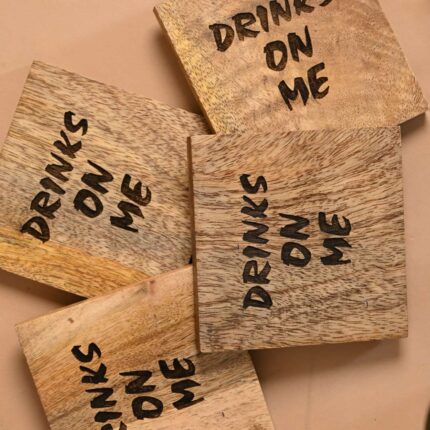 Crafted using recycled wood, each coaster carries its own natural grain and tone, making every piece unique. The engraved “Drinks on Me” quote adds charm without overpowering the minimal design, making these coasters suitable for modern, rustic, and contemporary interiors.