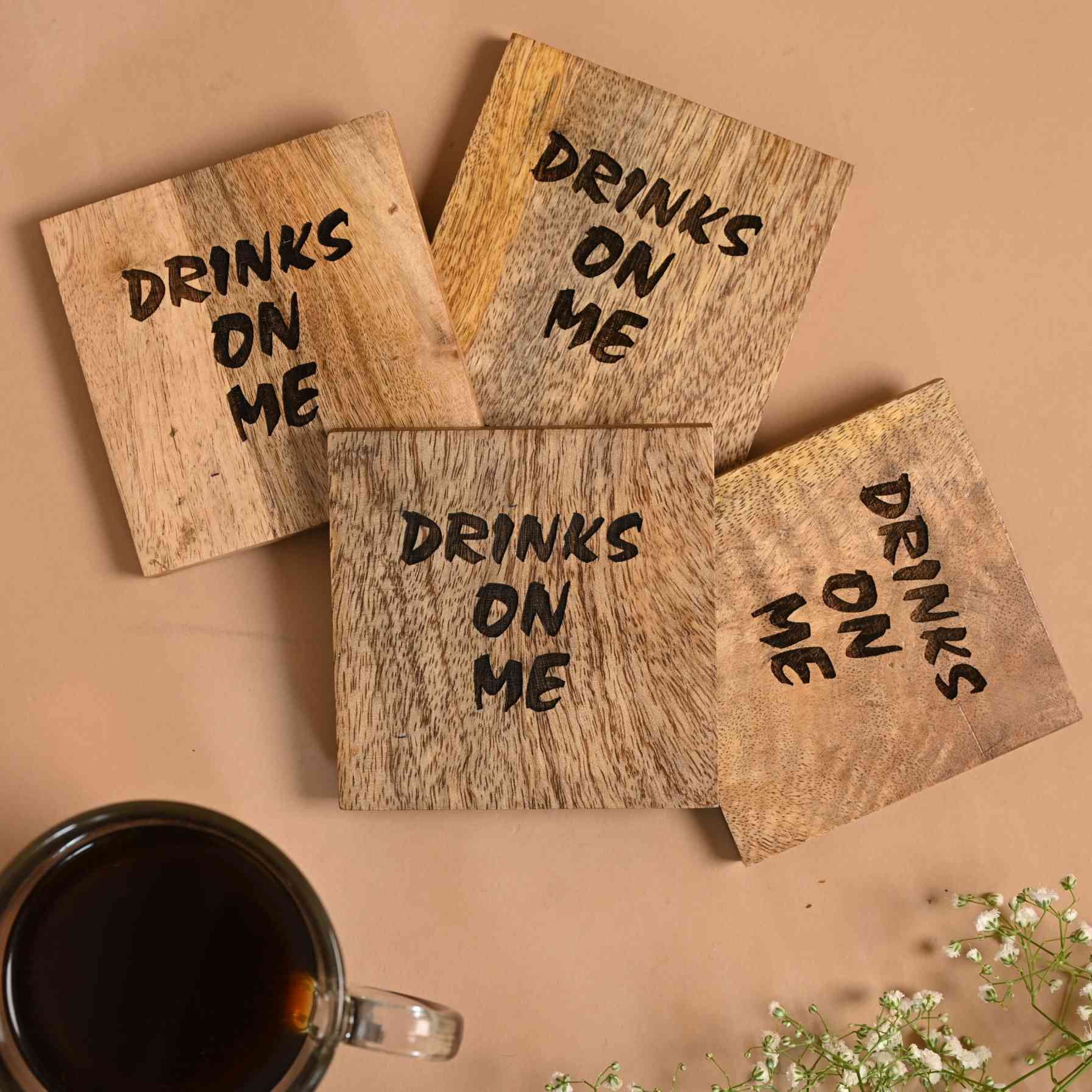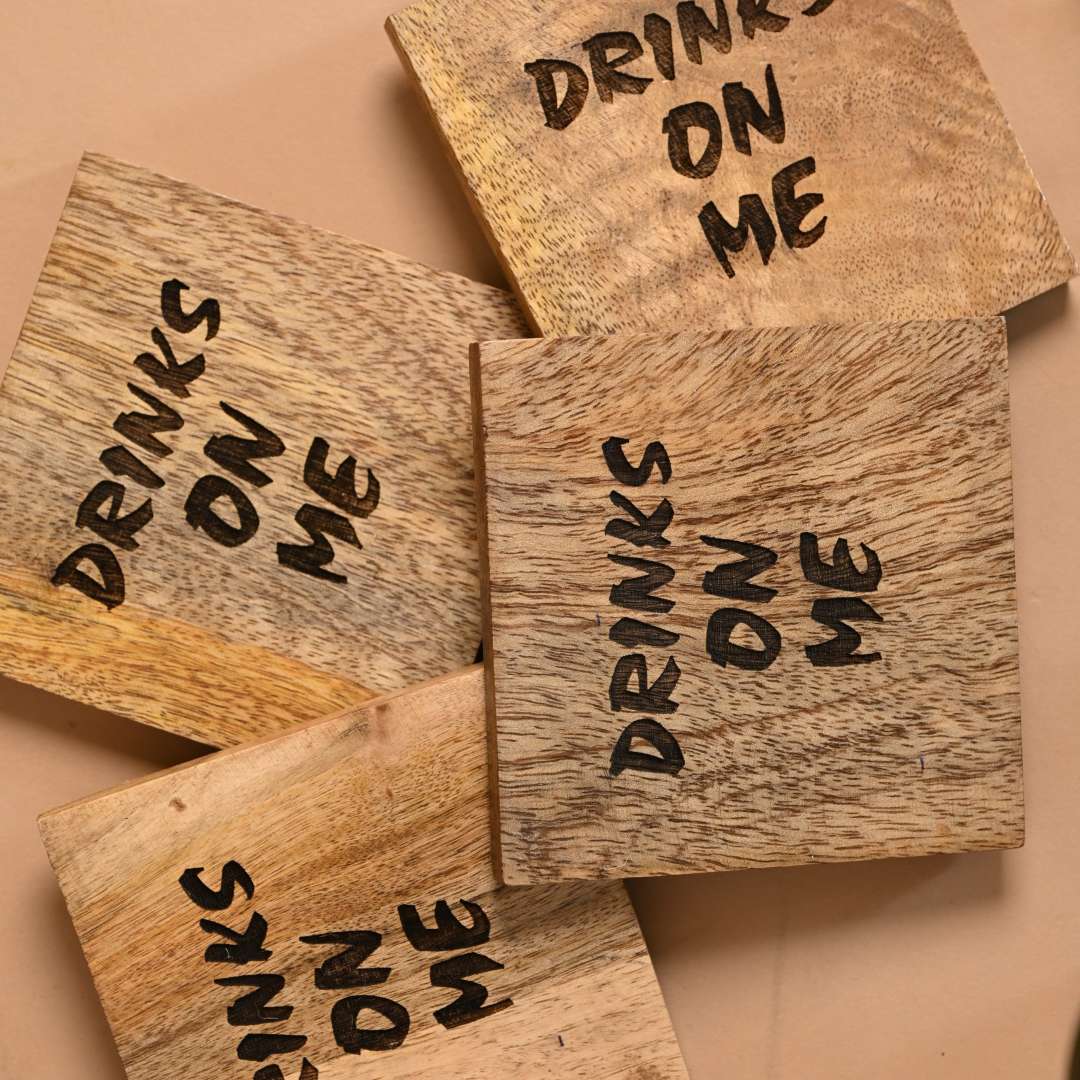 Shop these handcrafted “Drinks on Me” Wooden Coasters from the Noodle Studio collection, designed to bring personality, warmth, and sustainability to your everyday spaces. Perfect for coffee tables, bar counters, dining tables, and work desks, these wooden drink coasters add a light-hearted touch while protecting surfaces from heat marks, spills, and moisture.